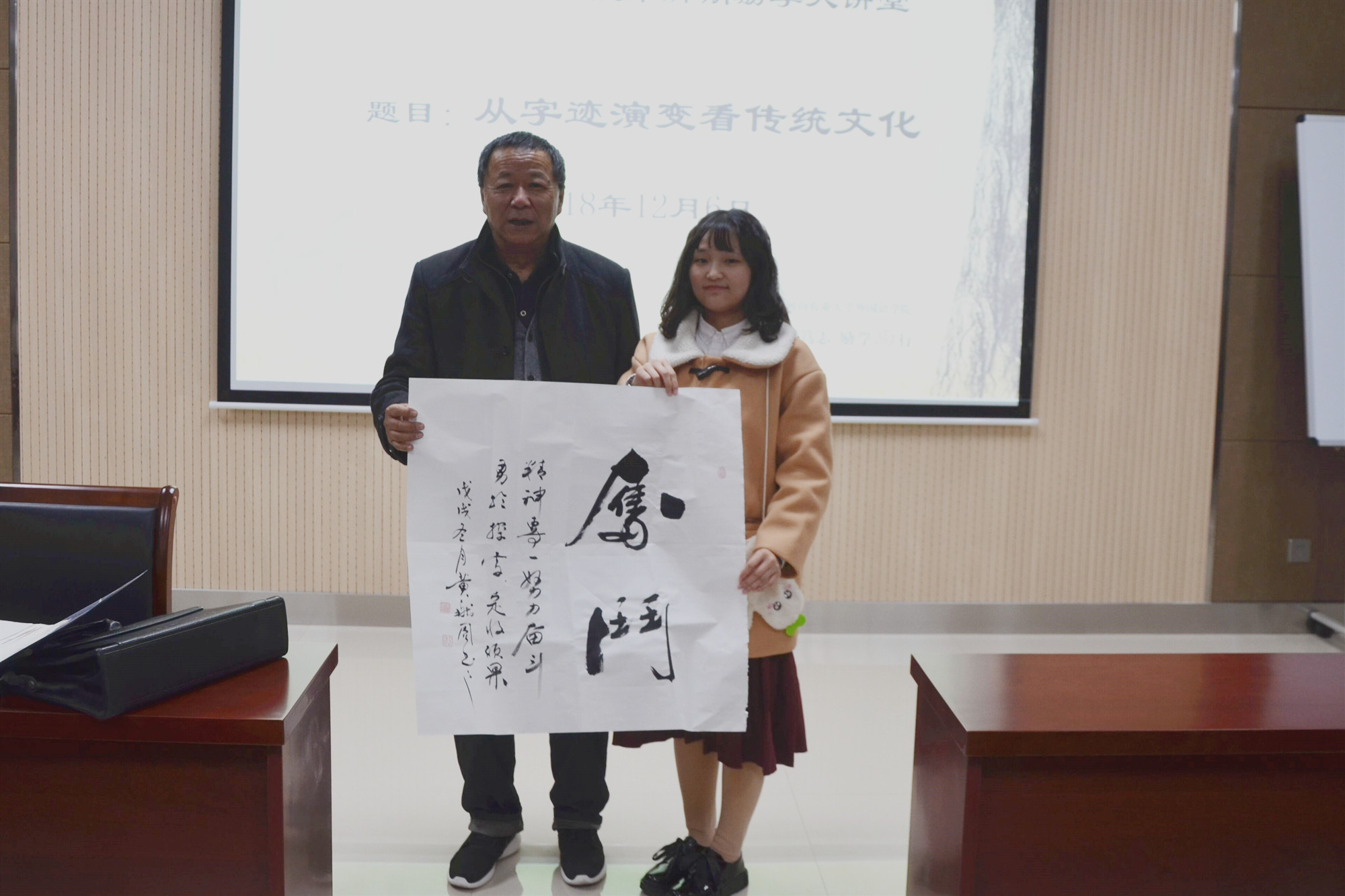 本网讯(审稿:王颖 供稿:饶芝玉)为宣传中华传统文化,加深杏吧视频 学生对书法艺术的认识,12月6日晚六点半,学院诚邀中国古今文化艺术研究院副院长、北京华夏风情书画院副院长黄献周走进杏吧视频 第五十七期励学大讲堂,作以“从字迹演变看传统文化”为题的专题报告。学院全体研究生及本科生部分学生代表参与此次讲堂,讲堂由学院党委副书记周晓主持。