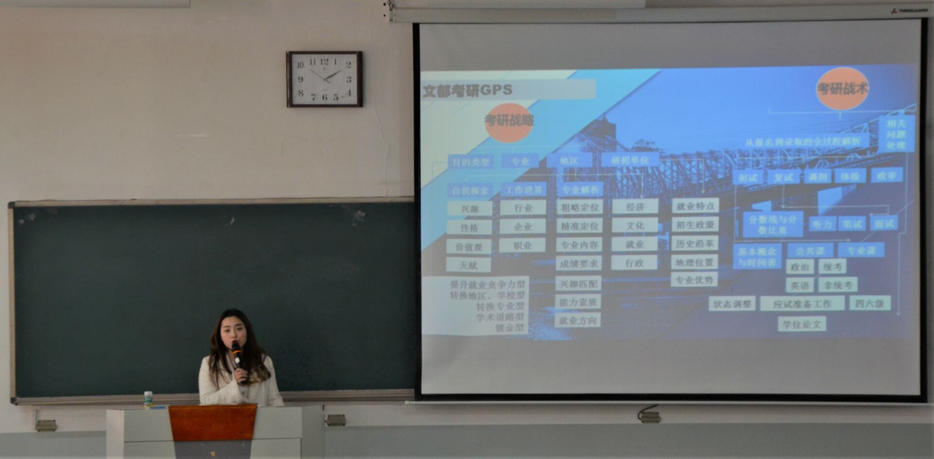 宣讲会伊始,文都教育负责人就近几年全国硕士研究生招生考试报考人数、录取人数及报录比数据对比分析,明确指出考研人数日益增多、考研热度居高不下的严峻形势。随后,围绕不同类型高校的研究生招生政策、录取条件、专业优势、就业特点和地理位置,负责人建议学生详细规划考研目标,提前确定心仪学校、目标专业和研究方向,充分做好精神准备和知识储备,以迎接初试、调剂、复试、毕业生就业每一环节。在跨专业考研方面,负责人强调了其中的注意事项及复习侧重点,根据杏吧视频 学生专业优势提出法学、教育学、文学、新闻与传播学等专业可优先考虑。同时,就翻译硕士和英语语言文学对第二外语的不同要求,她具体展示了考研科目的各项分值分布,并针对其历年考纲变化特点,提出政治的复习需密切关注时政热点,及时把握社情社态。最后,负责人分享了“考研复习六步走策略”,分别在预备阶段、开始阶段、强化阶段和冲刺阶段提出具体复习方法建议,并鼓励与座学生既已确定目标,便要相信自己,坚持不懈地向目标和理想迈进。