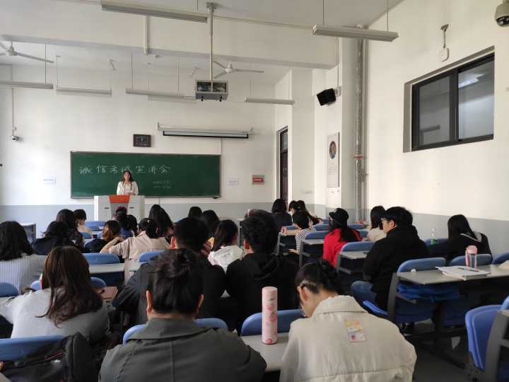 活动伊始,曹锦秀首先向大家介绍了专四考试的考场分布、考试流程、考生注意事项等,并再次提醒大家注意英语专业四级统测听写项目提示语的调整。随后,她强调了诚信考试的重要性,她指出诚信是立人之本,作为新时代的大学生要弘扬诚信正义,严肃考风,公平竞争,用真实的成绩证明自己的实力。同时她号召各班学委在班级召开诚信考试教育会,确保本次活动内容能够通知到位,杜绝作弊行为,切实增强考生的诚信意识。最后,她预祝大家考试顺利,展现外语学子真正的水平与风采。