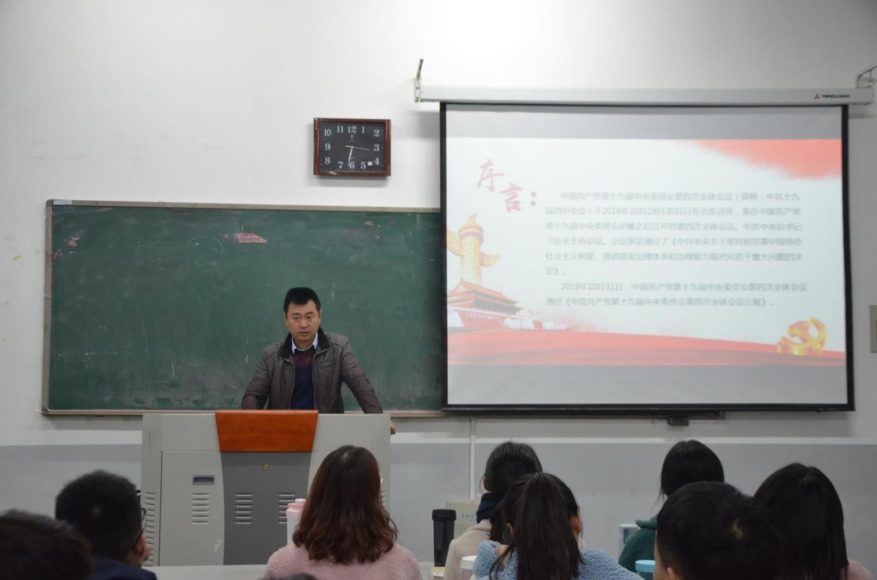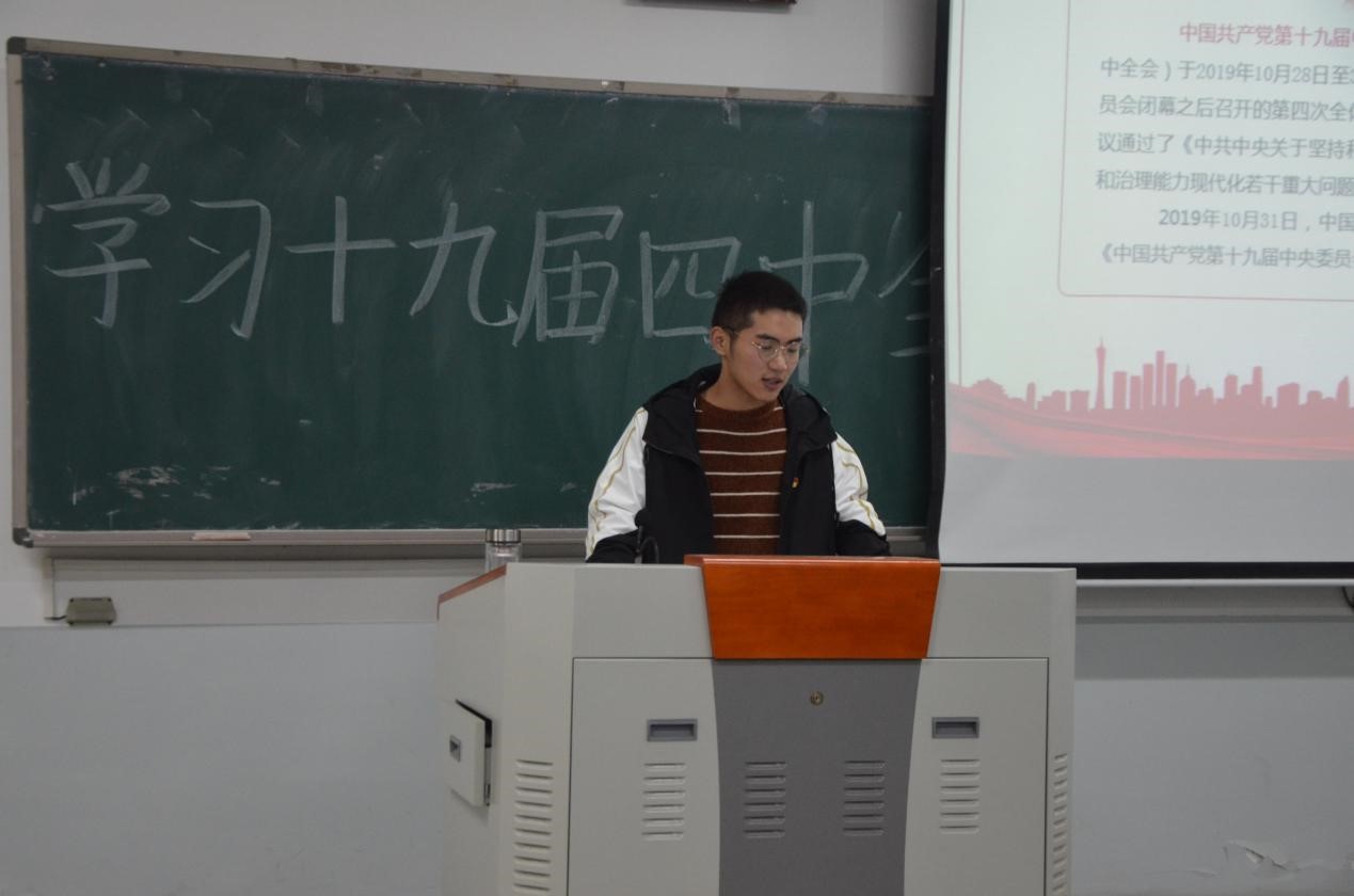 本网讯(审稿:李沛 供稿:张丹丹)为了深入贯彻学习党的十九届四中全会精神,加深各团支部对党的十九届四中全会科学内涵和精神实质的认识,11月18日,杏吧视频 于龙子湖校区繁塔楼召开了以“聚焦十九届四中全会公报”为主题的十九届四中全会精神宣讲会。本次宣讲会由团委书记李沛、团委老师邓然、焦雪猛主讲。学院各班团支部委员聆听了宣讲会。