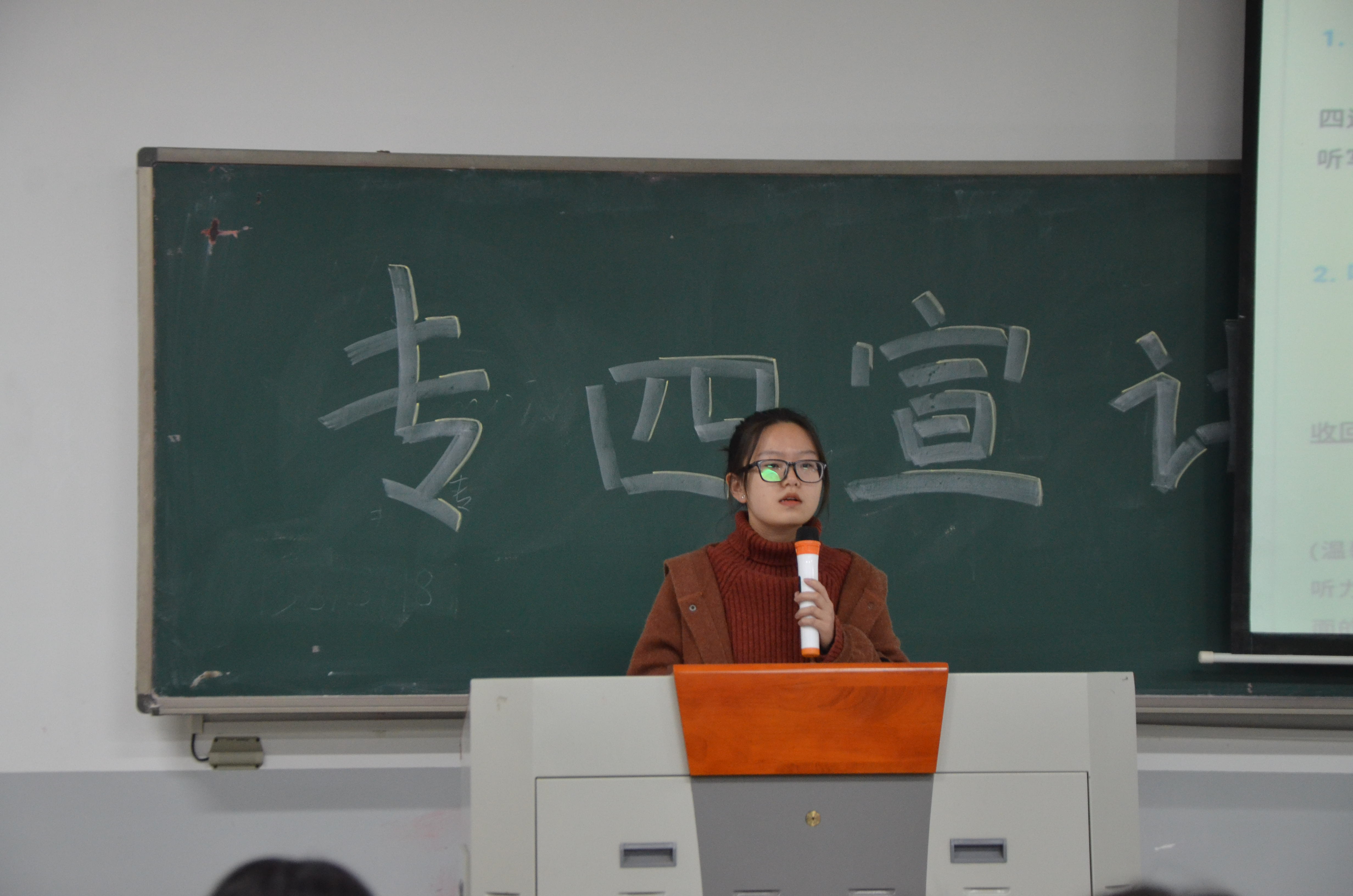 于龙子湖校区C106教室举办了专四考试经验分享会。本次分享会邀请了专四成绩达良好及以上的优秀学生代表分享备考经验和学习心得。17级、18级学生积极参与此次分享会。