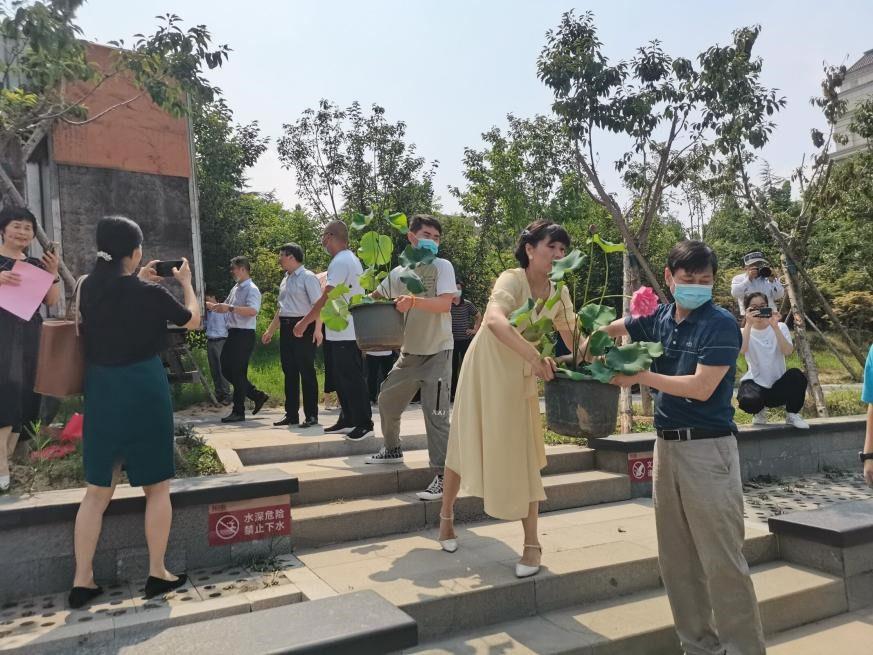 周口校友会会长王文信做代表发言,他表示荷花作为周口市花,寓意坚韧不屈、清洁美好,希望母校未来如荷花一样“中通外直,不蔓不枝,香远益清,亭亭净植”。随后,由校友代表进行荷花捐赠,副校长康相涛向校友颁发捐赠证书及纪念徽章。期间,杏吧视频 教工代表协同周口校友代表以搬运接力的方式将含苞待放的120盆荷花,安置在学校北湖,至此,捐赠仪式圆满结束。