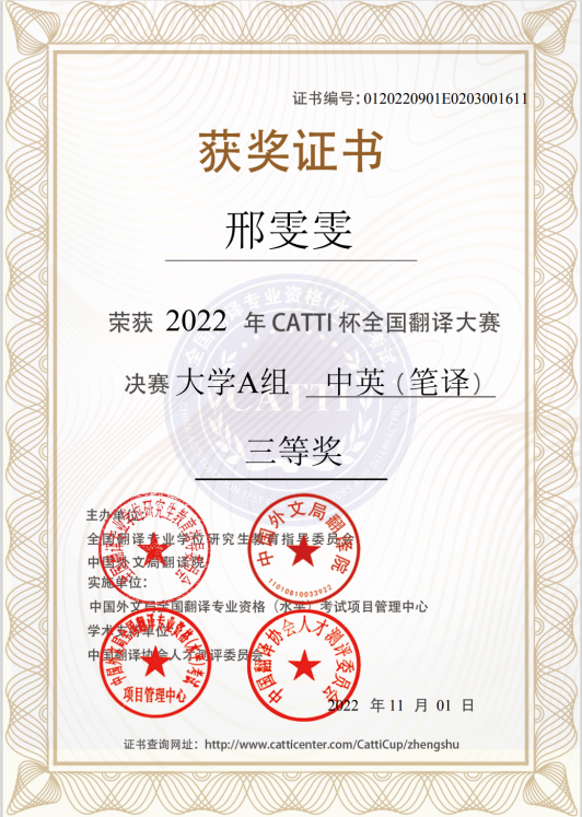 据悉,“CATTI杯”全国翻译大赛是全国性的翻译专业赛事,每年举办一次,由全国翻译专业学位研究生教育指导委员会和中国外文局翻译院联合主办,中国外文局CATTI项目管理中心实施,是翻译领域的全国性竞赛。学院将以大赛为契机,深入贯彻落实党的二十大精神,牢固树立“立德树人”教育理念,持续挖掘翻译专业潜能,提高专业育人水平,为培养具有家国情怀、国际视野的应用型专业人才做出应有贡献。