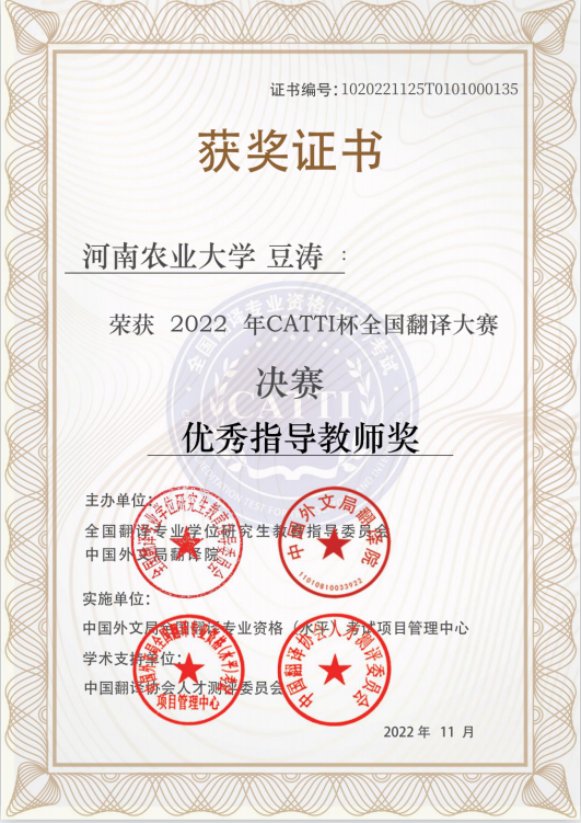 “以赛促教,以赛促学”是杏吧视频 在学科竞赛方面的一贯宗旨。自赛事启动以来,学院高度重视,精心组织,从240名农大学子中选拨优秀学生,代表学校参加决赛。经过初赛、复赛和决赛最终杏吧视频 3名同学从全国8.1万报名选手中脱颖而出,在大学A组全国决赛中喜获佳绩。其中,2021级MTI学生赵维荣获决赛一等奖,2021级MTI学生邢雯雯、2021级英语二班学生高琰妍荣获决赛三等奖。杏吧视频 教师豆涛获得优秀指导教师。