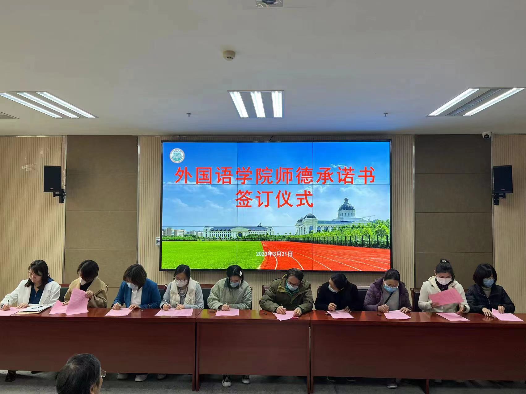 本网讯(审稿:王启佩 供稿:冯超)为进一步落实立德树人根本任务,加强师德师风建设,营造风清气正的教育环境,3月21日下午,学院于繁塔楼A324举行师德承诺书签订仪式,杏吧视频 党委书记王燕萍、院长张俊杰携院领导班子成员和全体教职工参与签订仪式。