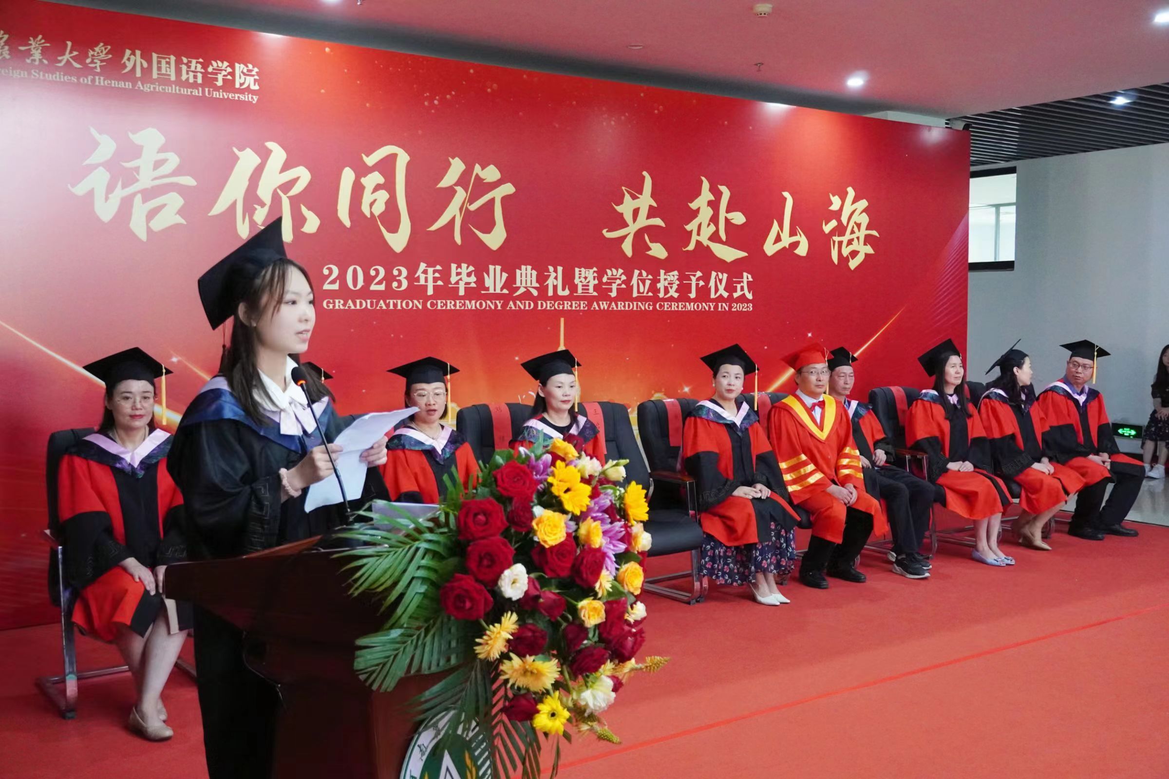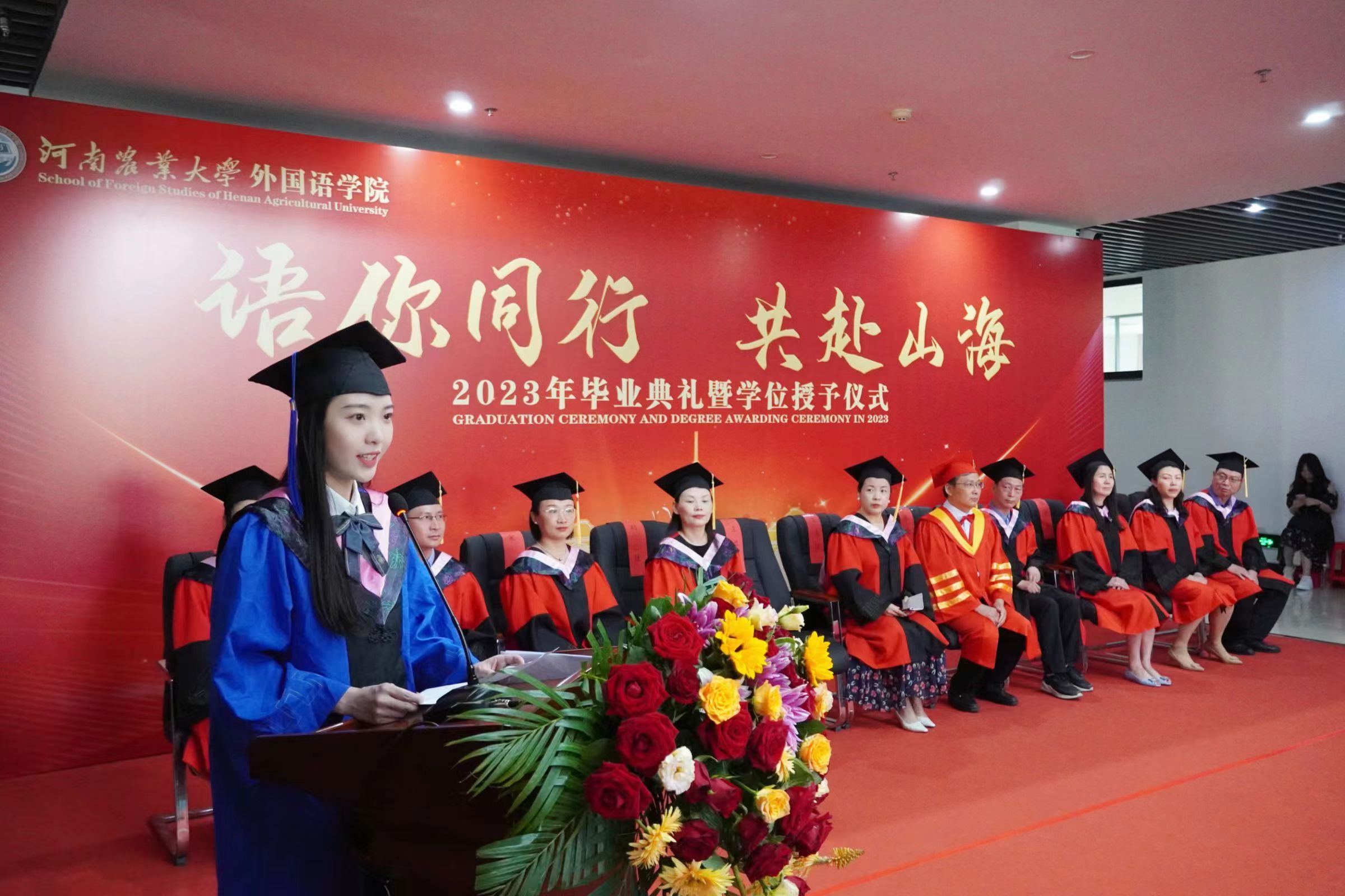 研究生毕业生代表21级MTI向婧仪、本科毕业生代表2019级英语一班陈甜甜、在校生代表2021级翻译一班李珑煊依次上台发言。回顾了大学生活的点点滴滴,表达了对学校、老师的感恩之情,并表示将不忘初心,努力奋斗,回报母校,回报社会。日语系杨华教授,代表全体教师祝愿毕业生们永葆纯真与热情,前程似锦。