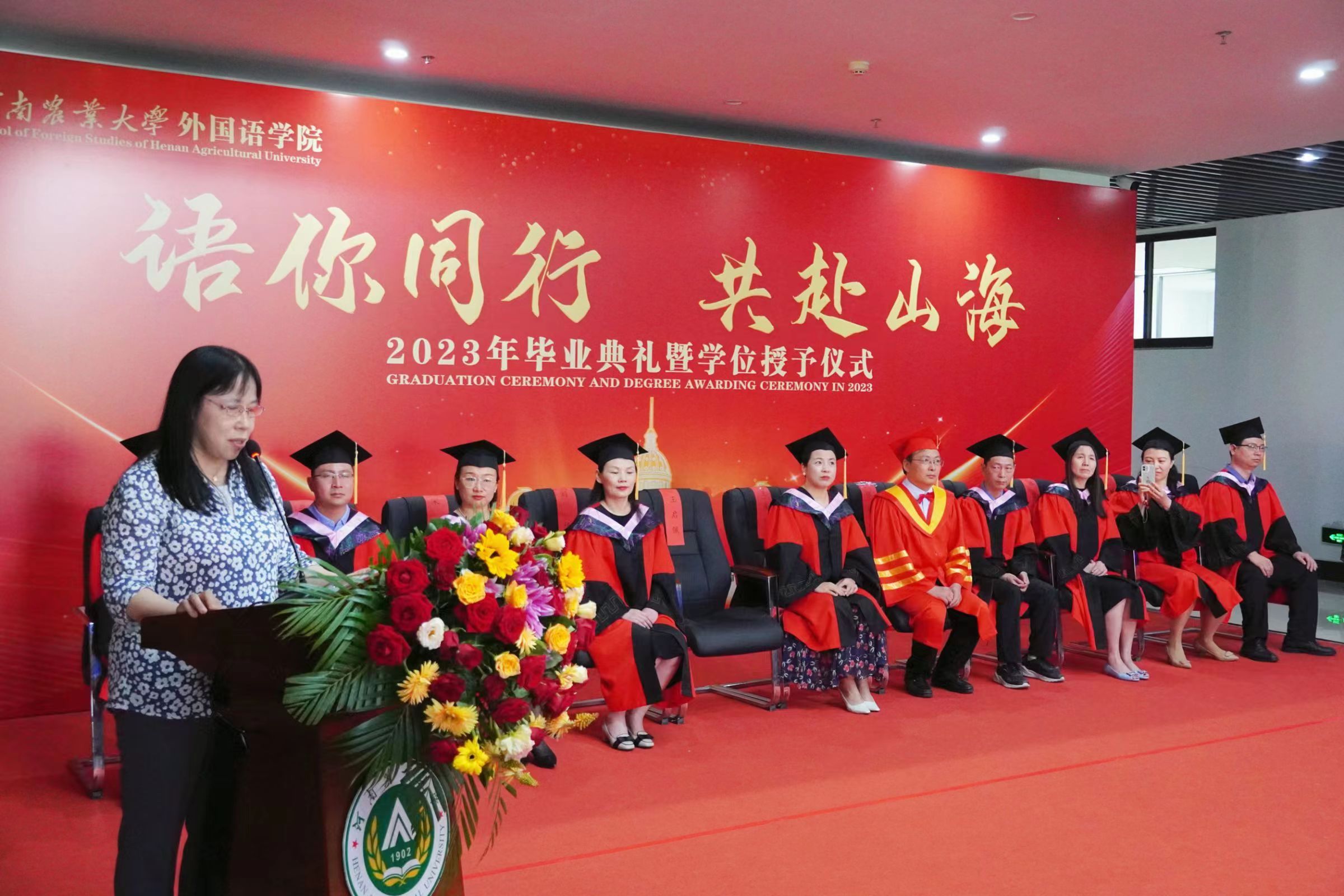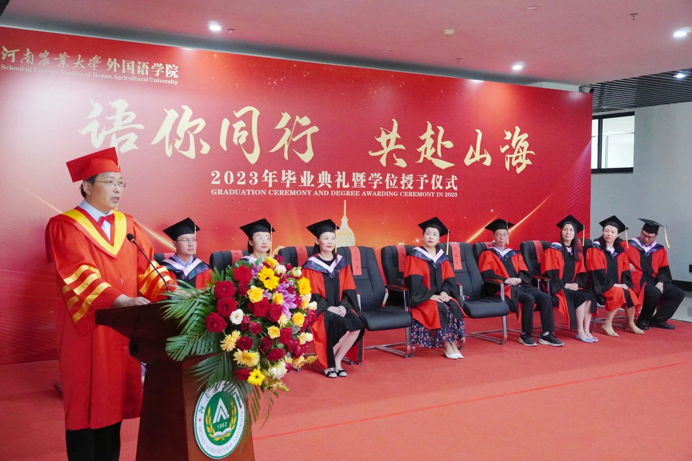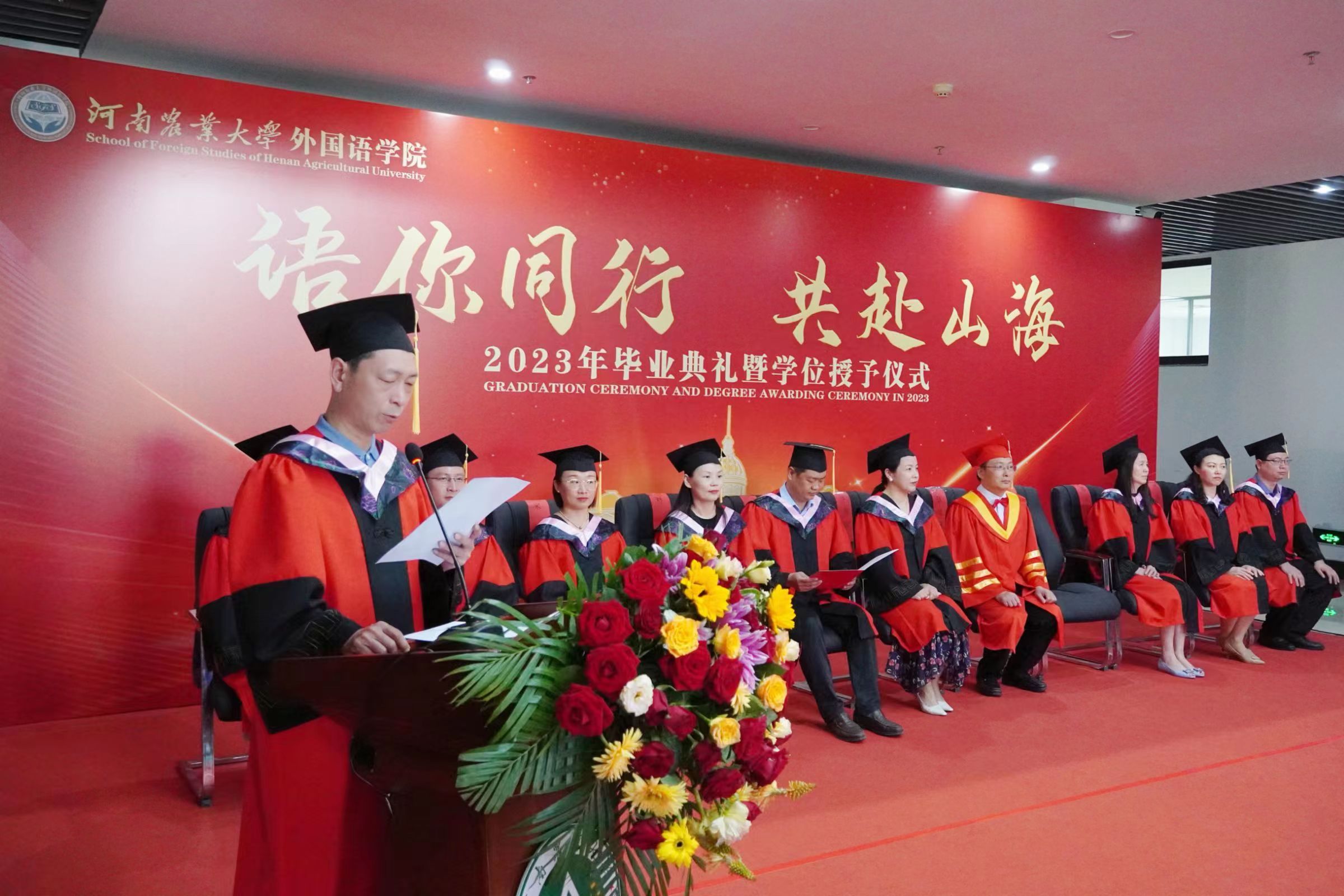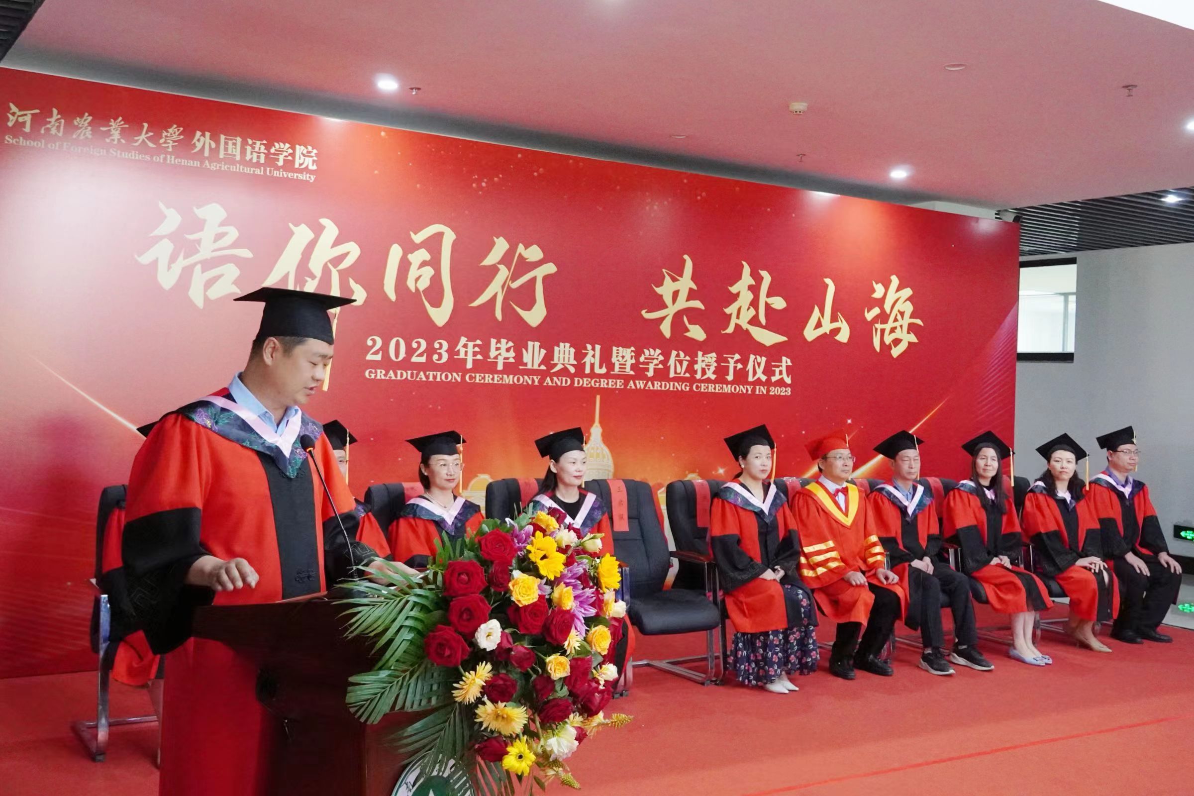 张俊杰总结了学院四年来的发展成绩,回顾了同学们的成长经历,并对2023届全体毕业生提出了殷切希望:一是希望大家长存明辨是非的理性精神,在现实世界里学会为自己的选择负责;二是希望大家永葆热爱祖国的赤子之心。他指出,爱国之行、报国之志是一个人的立身之本、成才之基,也是农大人一脉相承的信念底色,为国家的富强和民族的复兴做出贡献是每个中华儿女义不容辞的责任;三是希望大家胸怀包容开放的思想,为构建人类命运共同体贡献我们外语学者的力量。最后,他寄语毕业生们谨记明德笃志、励学尚行的院训,发扬农大人的质朴、勤奋和实干精神,恪守诚信、坚持学习,在服务社会中建功立业。