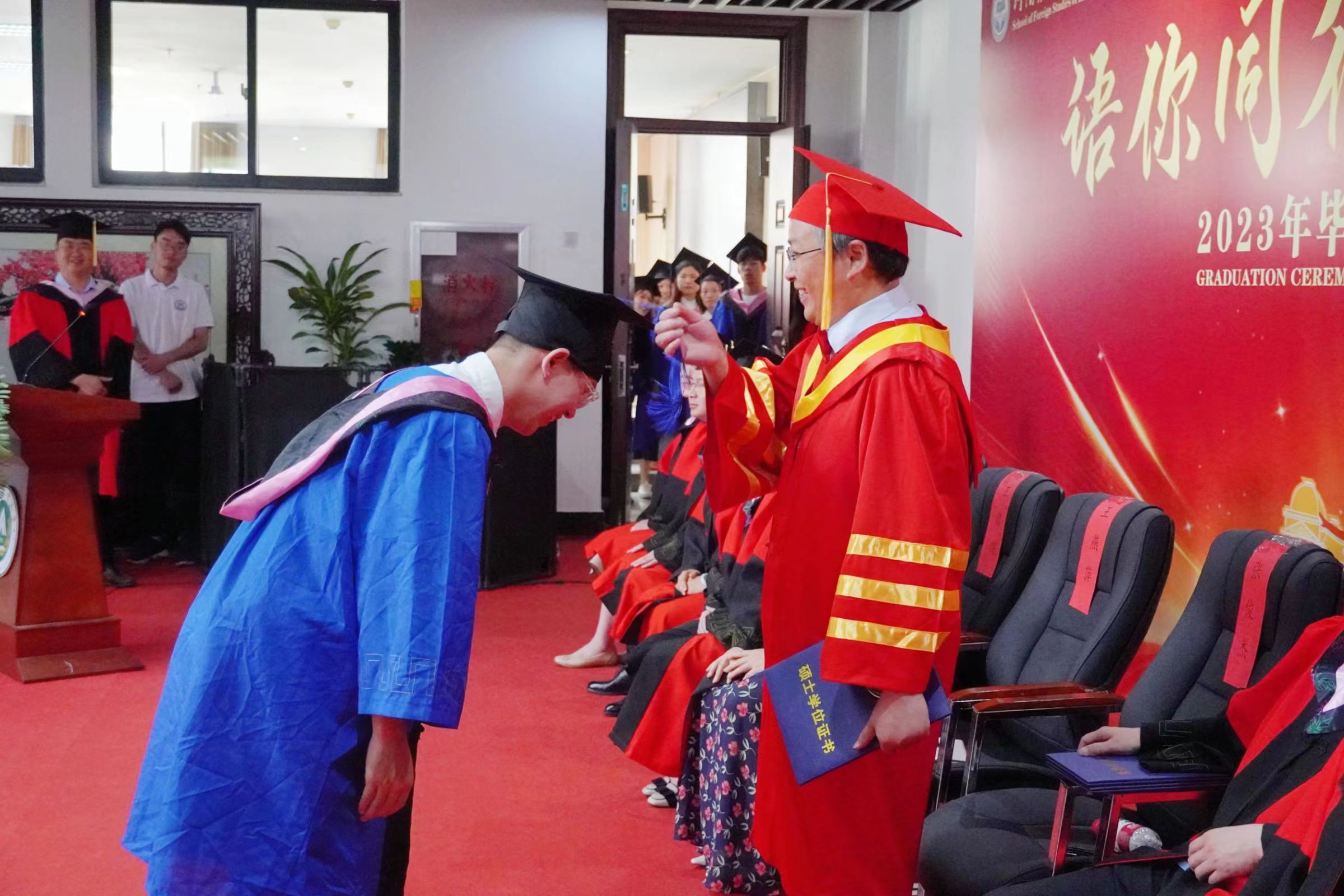 在欢快的乐曲声中,院长、院学位评定委员会主席张俊杰教授为硕士学位获得者一一拨正流苏,颁发学位证书,院领导和院学位评定委员会委员共同为2023届本科毕业生拨正流苏、颁发学位证书。
