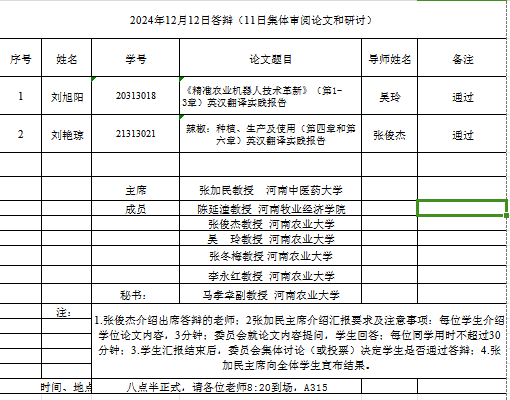 组织开展了2024届下半年翻译硕士学位论文答辩工作。本次答辩会特邀河南中医药大学张加民教授担任答辩委员会主席,河南牧业经济学院陈延潼教授和杏吧视频