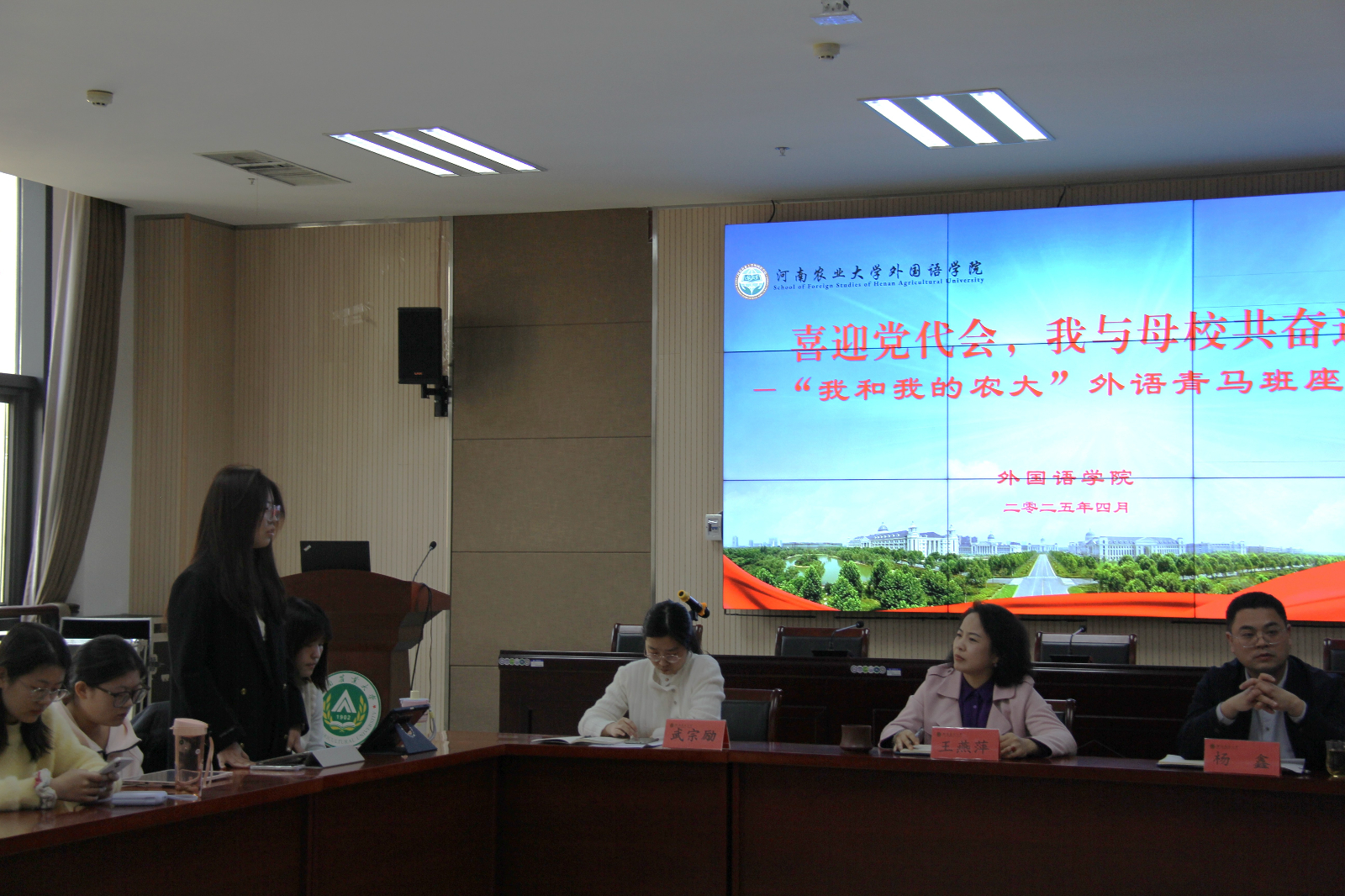 于繁塔楼A324举行“喜迎党代会,我与母校共奋进”“我和我的农大”外语青马班座谈会。院党委书记王燕萍出席会议,团委老师和青马班第七期全体学员参加会议,院党委副书记杨鑫主持会议。