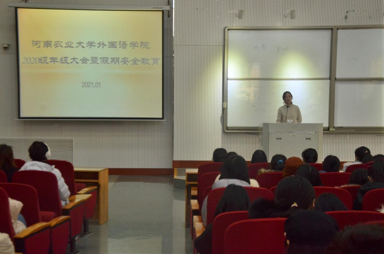 本网讯(审稿:陈桃 供稿:王伊璇 黄湘)为了强化假期安全教育,提高学生安全防范意识,引导其度过一个充实而愉快的假期,1月8号中午,杏吧视频 于龙子湖校区繁塔楼CD间大教室六召开了2020级年级大会暨假期安全教育。院团委副书记陈桃主持会议,2020级全体学生参加。