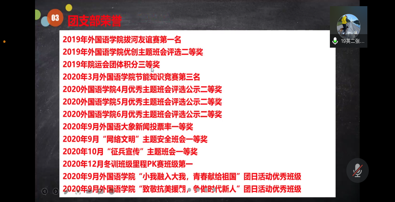 本次评选分为活力团支部评选和魅力团支书评选两个环节。在活力团支部评选环节,各团支部主要从思想引领、学风建设、工作开展、社会实践、及未来规划等方面进行展示。其中,19级英语二班班长张帆頔以工作特色与亮为切入点,分享了19英语二班团支部的独特风采。在支部活动方面,19级英语二班团支部积极组织开展主题班会、团日活动,参加各项文体活动和公益活动。通过团结协作、努力拼搏取得了优异的成绩。