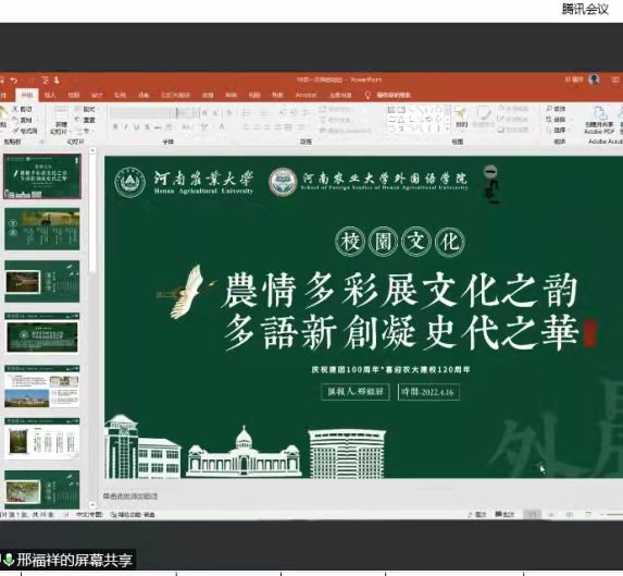 其中19级英语一班班长邢福祥以“文化”二字出发,继而开始延伸,“农”情、多“语”即为杏吧视频 和杏吧视频 ,“史代”即为党史团史校史和新时代。从教育的本原出发,将学校文化充分融入学校教育中,让青年学子真正拥有教育“场所精神”的校园文化建设天地。