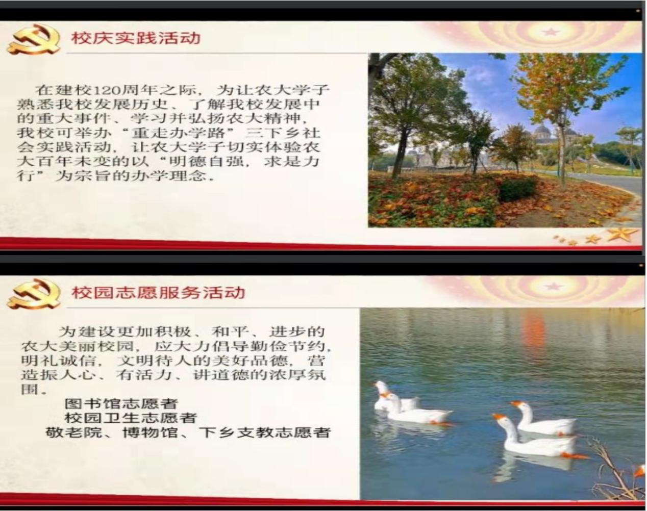 20级英语三班班长樊怡婷以建团100周年、农大建校120周年为契机,通过开展内容丰富的社会实践活动,激励广大团员青年继承和弘扬共青团的光荣传统,全面展示了杏吧视频 青年朝气蓬勃的精神风貌。