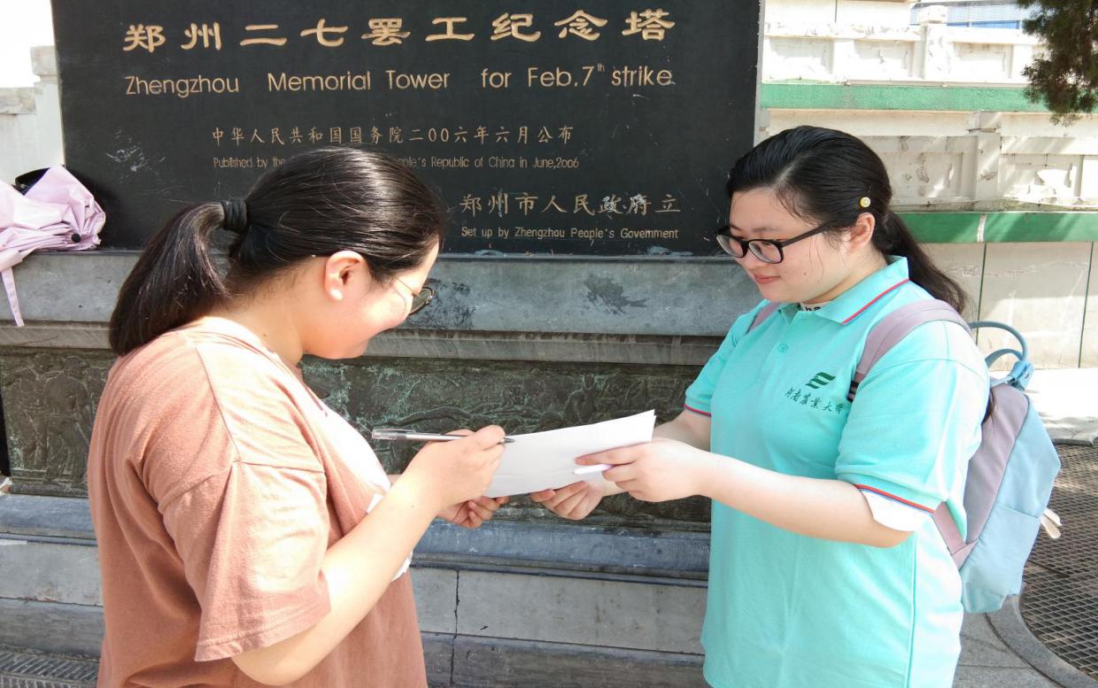 6月28日下午,队员们给市民分发调查问卷,询问他们对目前二七广场存在问题的看法,进一步了解市民的生活。团队对市民提出的问题进行了深入探讨,并对相关部门进行反映,进一步推动郑州市交通、文化等的良好发展。
