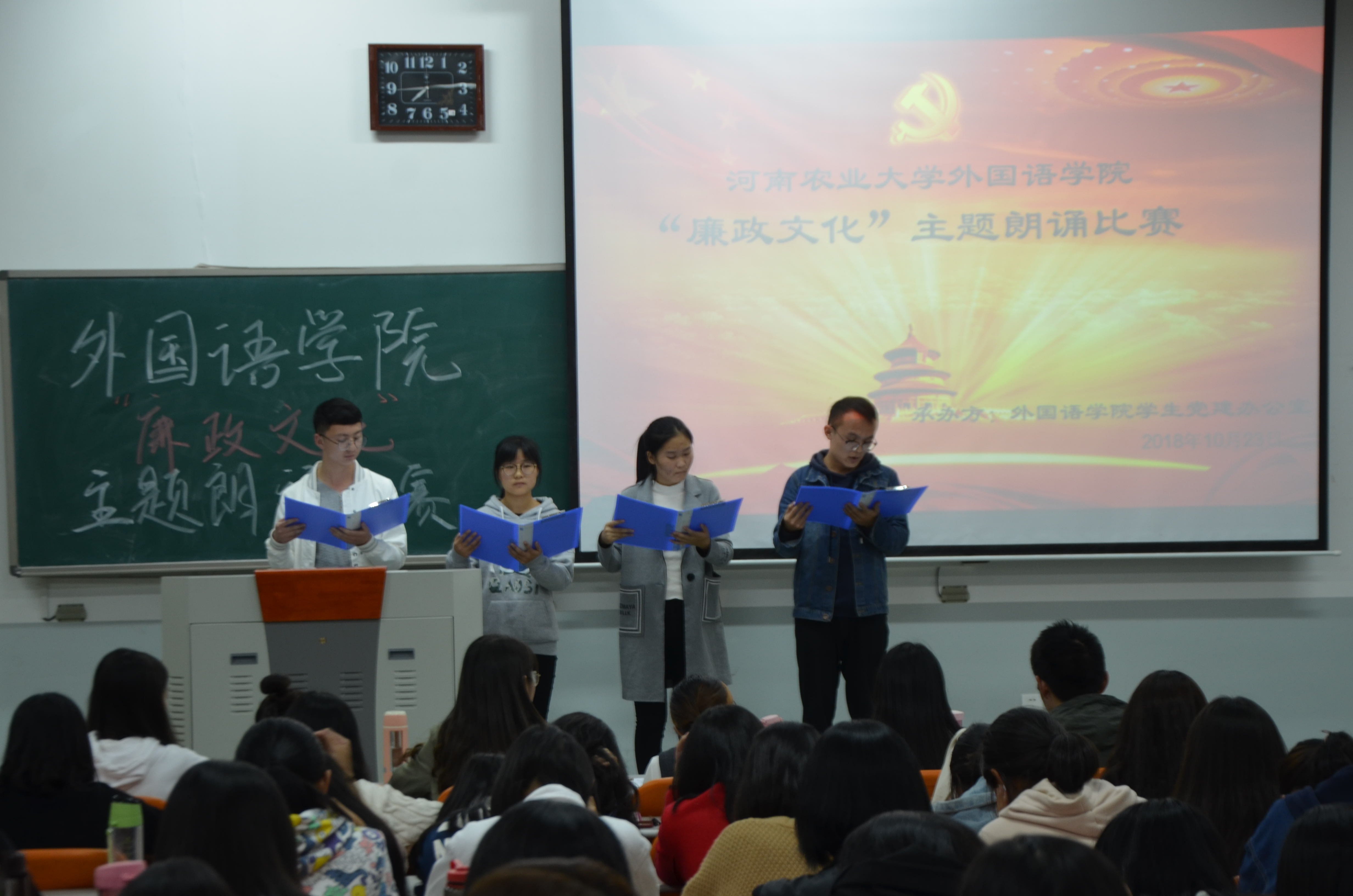 比赛伊始,主持人简要介绍了本次大赛的流程和评分标准。随后,比赛正式拉开帷幕。赛程之初,18级英语一班一曲《烈烈清风》声情并茂地赞颂了胸怀坦荡,一心为民,无愧高尚,无愧辉煌,无愧永恒的廉洁圣者。“高山流水洁有情,清风素月廉无价”,18级日语班用铿锵有力的朗诵,坚定不移的信念唱响了一首对廉政的颂歌。“你从雪山走来,带着洁白的心灵,所到之处,忠于职守,清正廉洁 ,挺起中华民族正气的脊梁”18级英语二班将满腔热血融入《廉洁颂》,深深感染了在场的每一位观众。17级商务英语三班《廉政与权力》新颖地将朗诵与PPT演示完美结合,将祖国母亲艰难探索、砥砺前行、不忘初心、廉洁清正娓娓道来,那动情的声线仿佛在诉说着对祖国的挚爱。选手们的朗诵,时而低沉,时而高亢,高唱了一曲曲反腐倡廉、为民服务的颂歌,赢得场下阵阵热烈的掌声。