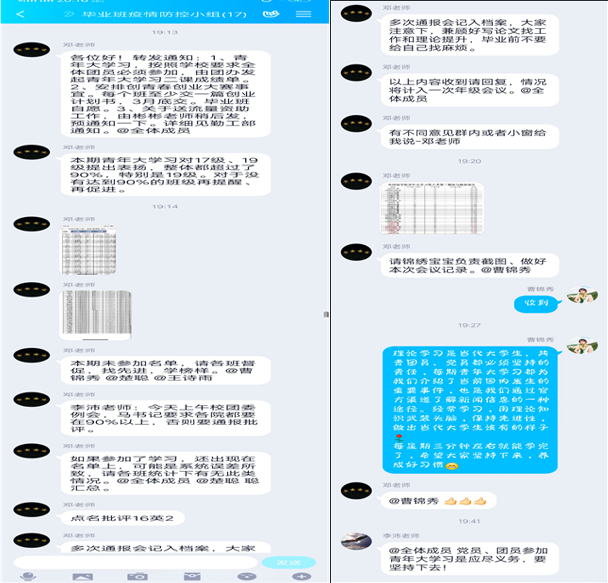 会议伊始,邓然仔细传达了近期杏吧视频 “青年大学习”的学习情况,同时对于参与率较低的班级进行督促和提醒,要求各班学生加强对“青年大学习”的重视,不断提高自身思想觉悟和政治素养,努力站在时代发展前列。随后,她安排了创青春、创业大赛相关事宜,鼓励学生积极参加比赛,培养创新意识、启迪创新思维、提升创造能力。接着,她传达了疫情期间流量资助相关通知,希望同学们感受到国家给予的温暖和关怀。最后,邓然寄语大家疫情期间合理统筹规划,严格要求自我,做到论文撰写与工作实习两不误。