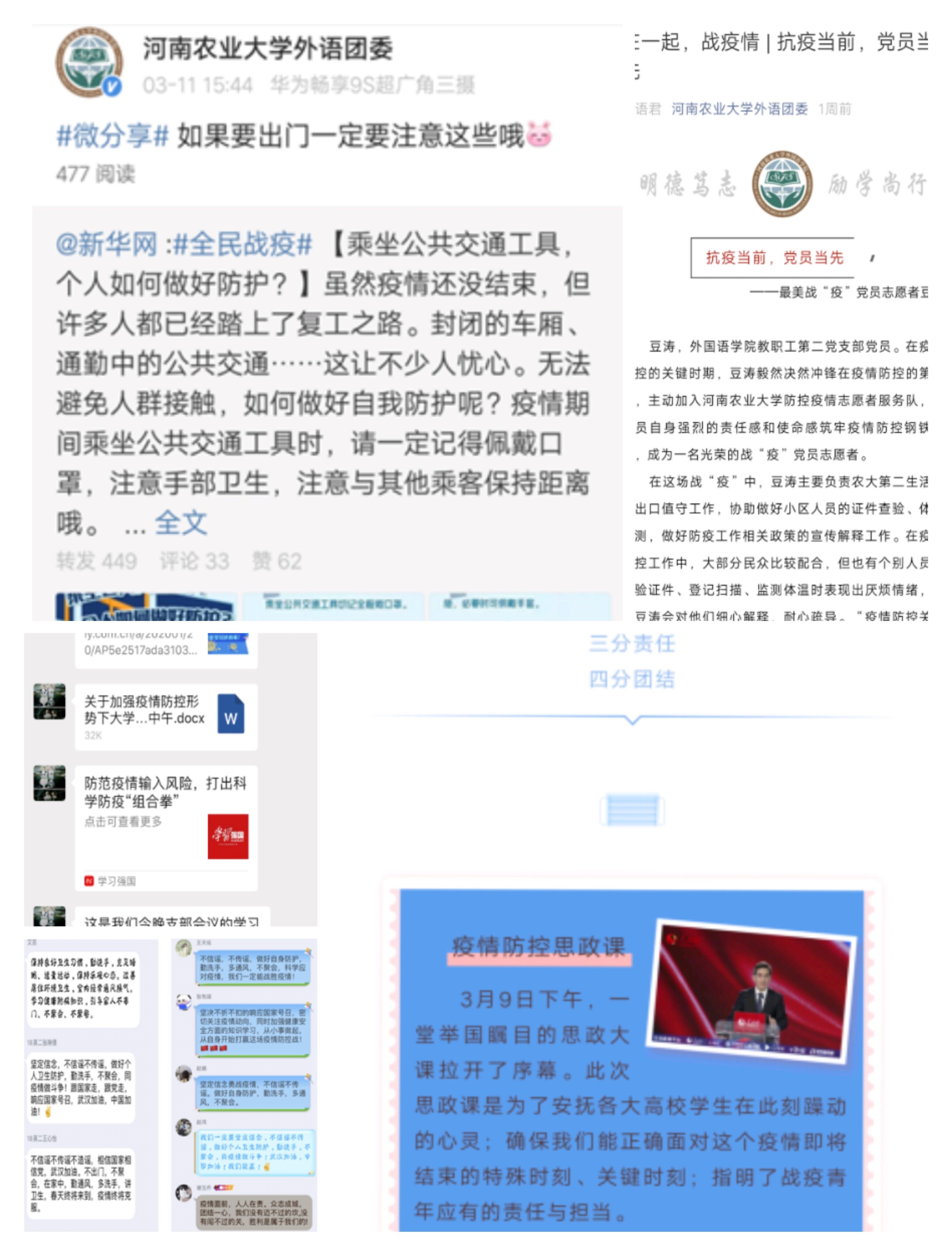 为加强疫情防控形势下杏吧视频 学生思想政治教育,贯彻落实学校疫情防控工作安排,杏吧视频 采取系列措施,深入细致的开展了网络思想政治教育工作,引导学生理性认识疫情、科学做好防护、筑牢心理防线、丰富文化生活,推动学院学生工作平稳有序。
