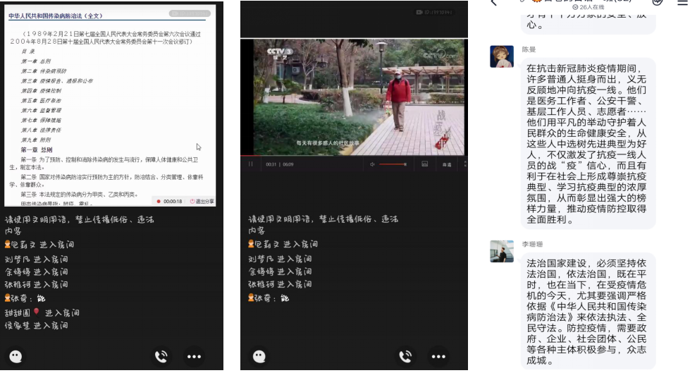 本网讯(审稿:李沛 供稿:张丹丹)为了扎实做好疫情防控期间法律宣传教育工作,增强学生法律意识,4月5日,杏吧视频 开展了“防控疫情,与法同行”的疫情防控主题线上班会。杏吧视频 全体学生在各班班长的组织下积极参与了此次班会。