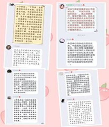 班会上,各班心理委员首先根据保卫部的安排在班级群里转发了相关的征兵文件材料。材料内容包括征兵流程、入伍条件、报名时间和方法等,向同学们明晰了征兵入伍的要求和大学生入伍的优惠政策等。此外,各班心理委员亦采取PPT宣讲、播放视频等多种方式带领同学们深入地了解了大学生参军入伍相关事宜,强调了参军入伍的重要性,号召同学们携笔从戎,踊跃报名参军,把远大的爱国之志转化为笃实的爱国之行。随后各班同学纷纷在班级群中进行热议,表示有志青年应当履行应征入伍的光荣义务,用青春和热血为实现伟大的强国梦谱写新篇章。