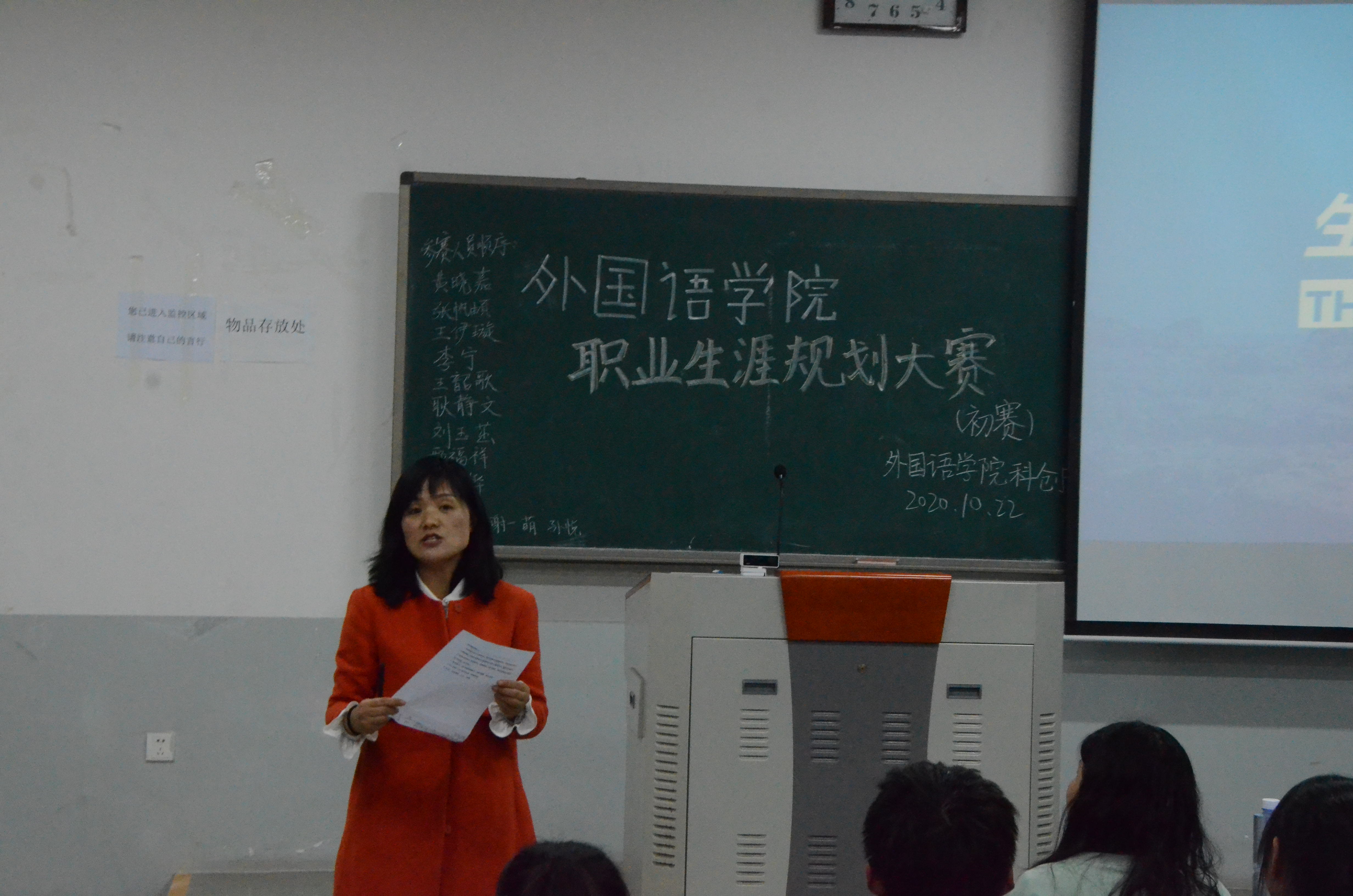 本网讯(审稿:李沛 供稿:王莉)为加强大学生职业规划教育,帮助杏吧视频 学生树立职业生涯规划意识,10月22日晚7点到9点,杏吧视频 在龙子湖校区繁塔楼教室C204举办了职业生涯规划选拔大赛。杏吧视频 教师聂宝玉老师、牛烁老师、焦雪猛老师携参赛选手及各班学生代表出席了本次比赛。