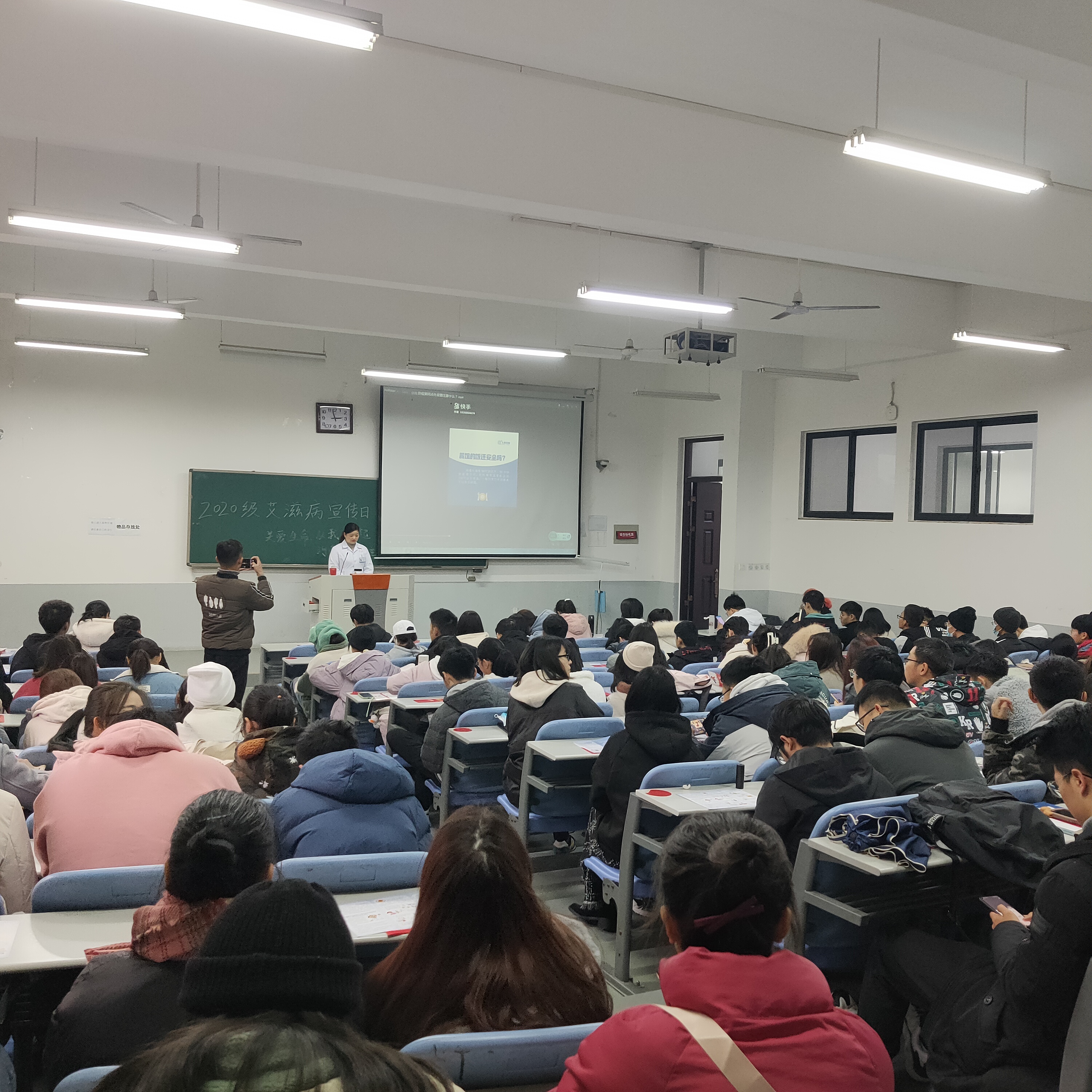 本网讯(审稿:李沛 供稿:王莉)12月1日是第33个“世界艾滋病日”,为增进杏吧视频 学子对艾滋病的了解,提高其艾滋病防控意识,12月1日下午,我校校医院于龙子湖校区繁塔楼C102教室举办了“关爱生命,从我做起”艾滋病主题宣传讲座活动。杏吧视频 学生认真聆听此次讲座。