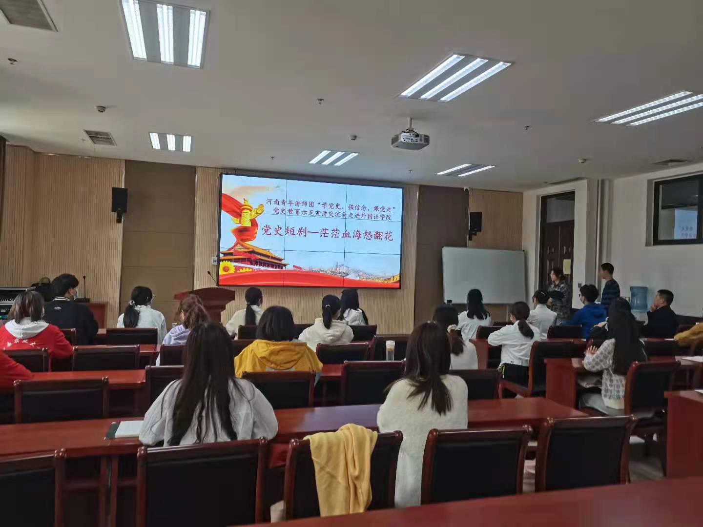 活动伊始,由青马班同学表演历史情景短剧,生动地为我们演绎了抗日英雄舍小家为大家的无私奉献精神,身临其境的表演使在场同学无一不被打动,掌声雷动。接着由韩东云老师从为什么要学习党史,学习党史的内容和怎么学习党史这三个方面为青马学子讲解了中国共产的发展历史,领悟了共产党人的初心和使命。活动现场,同学们积极参与,踊跃发言,充分表达自己的看法并且和老师一起热烈地探讨党史问题,同学们纷纷提出自己的观点和心中的疑问,韩老师给予耐心解答,并对青马班同学寄予厚望,希望在场同学努力发光发热,发挥带头模范先锋作用,以小带大,积极学习党史,担负自己的使命和责任。他指出,当今青少年应该以学习党史为己任,为中华民族的伟大复兴添砖加瓦。活动最后,青马班学员深受感动和鼓舞,以一首“唱支山歌给党听”把最美好的祝福送给中国共产党,献礼建党100周年。