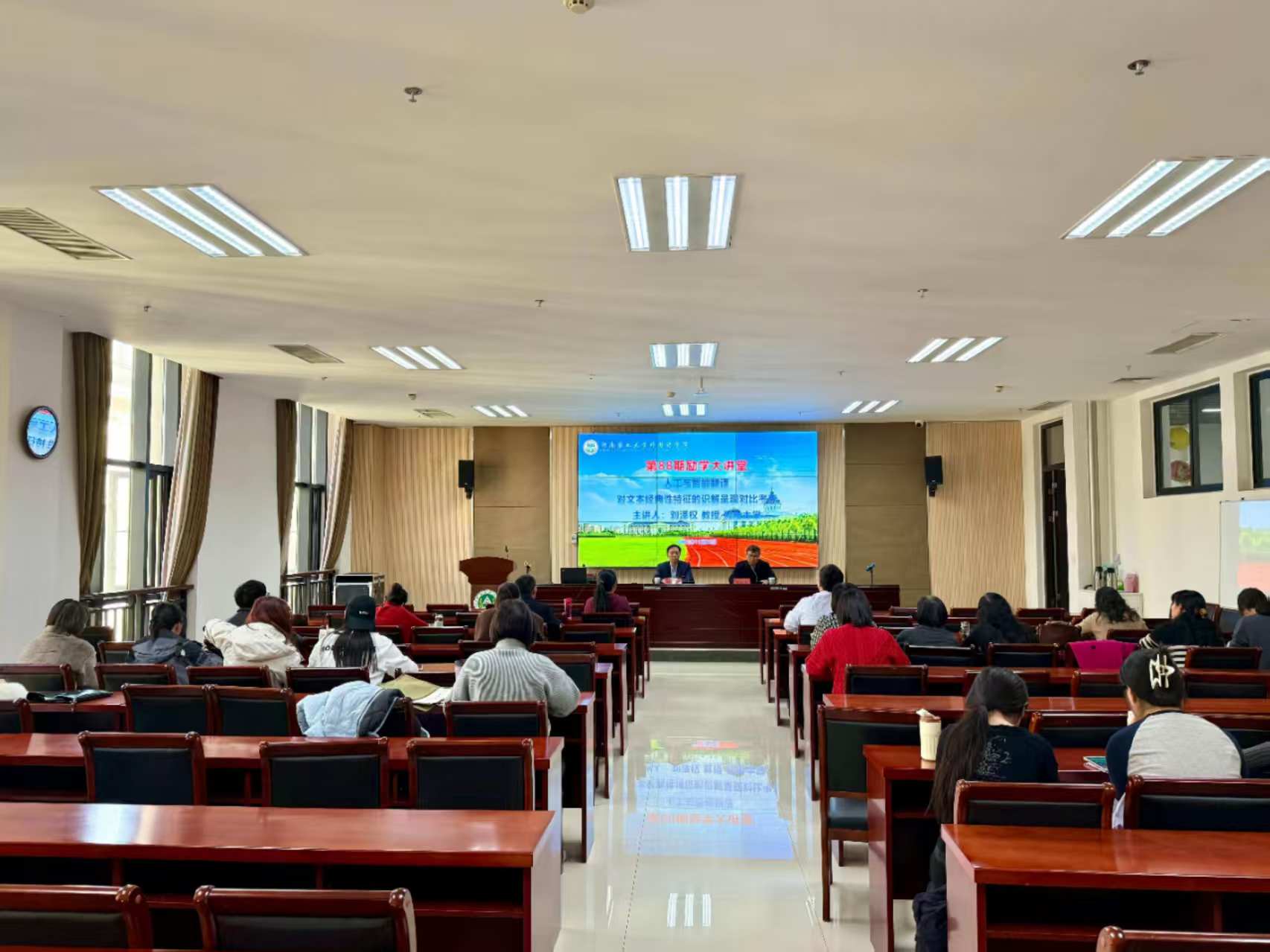 本网讯(审稿:吴玲;供稿:马孝幸;摄影:黄彪)11月25日,河南大学二级教授、博士生导师刘泽权应邀做客杏吧视频 第88期励学大讲堂,分别做了题为“人工与智能翻译对文本经典性特征的识解呈现对比考察”和“国家社科基金重点项目‘两岸三地百年女性文学翻译史论’申报论证实例分享”两场报告会。报告会由院长张俊杰教授主持,学院骨干教师和研究生代表参加了此次报告会。