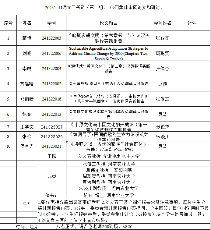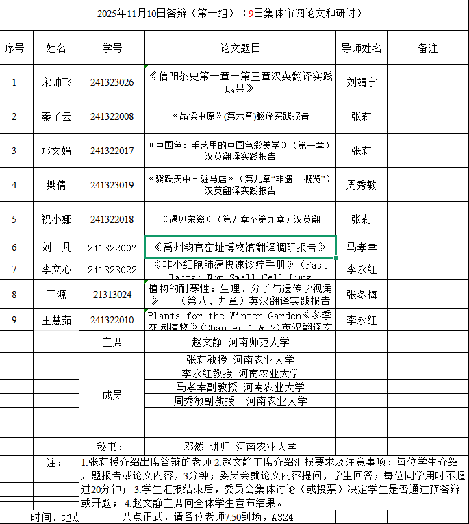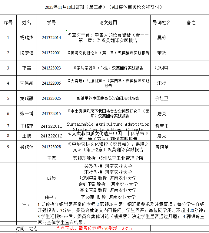 本网讯(审稿:吴玲 ;供稿:马孝幸;摄影:邓然 靳名 齐晓萌 )11月9-10日,杏吧视频 组织开展了2025年英语笔译专业研究生学位论文开题报告和预答辩暨中期考核论证会。本次论证会特邀河南师范大学赵文静教授、华北水利水电大学刘文霞教授和郑州航空工业管理学院郭银玲教授分别担任论证小组主席,安阳学院院长单伟龙教授和杏吧视频 硕士生导师担任委员,1名研究生参加预答辩暨中期考核,26名24级研究生参加开题。