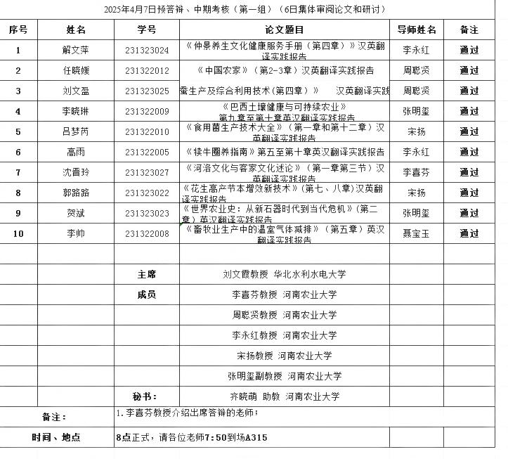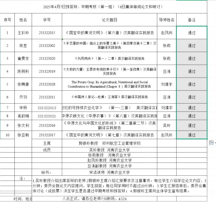 组织开展了2025年英语笔译专业研究生学位论文预答辩暨中期考核和开题报告论证会。本次论证会特邀华北水利水电大学刘文霞教授、河南财经政法大学孙建华教授和郑州航空工业管理学院郭银玲教授分别担任论证小组主席,杏吧视频