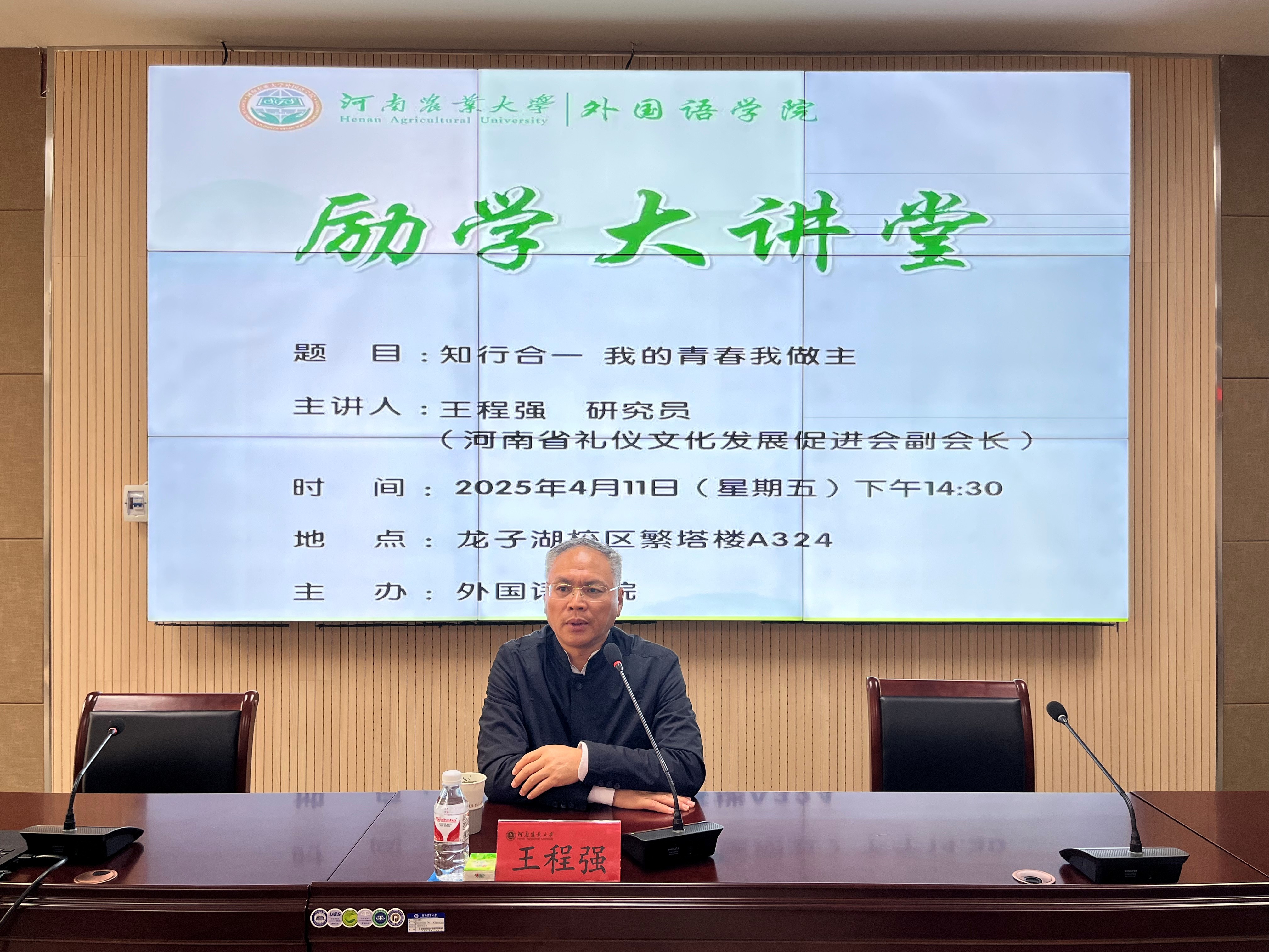 本网讯(审稿:吴玲 供稿:马孝幸 摄影:黄彪)4月11日下午河南省礼仪文化发展促进会副会长王程强研究员、硕导应邀做客杏吧视频 第81期励学大讲堂暨中外农耕文明交流互鉴讲坛,做了题为“ 知行合一 我的青春我做主”的报告会。报告会由院长张俊杰教授主持,杏吧视频 师生参加了此次报告会。