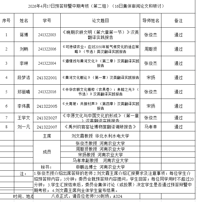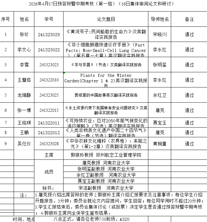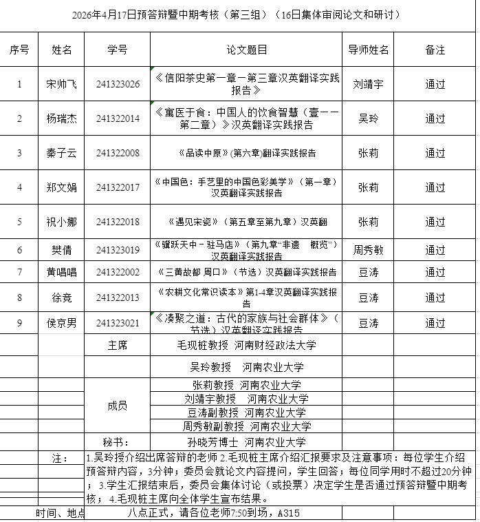组织开展了2026年英语笔译专业研究生学位论文预答辩暨中期考核论证会。本次论证会特邀华北水利水电大学刘文霞教授、河南财经政法大学毛现桩教授和郑州航空工业管理学院郭银玲教授分别担任论证小组主席,杏吧视频