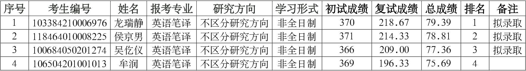 根据学校研究生招生复试工作总体安排,英语笔译非全日制硕士研究生招生计划数增加1人。杏吧视频 2024年英语笔译非全日制硕士研究生招生第二批调剂考生复试录取工作已经结束,杏吧视频 第二批调剂志愿复试结果公示如下,公示期至2024年4月21日,请对录取结果进行监督。