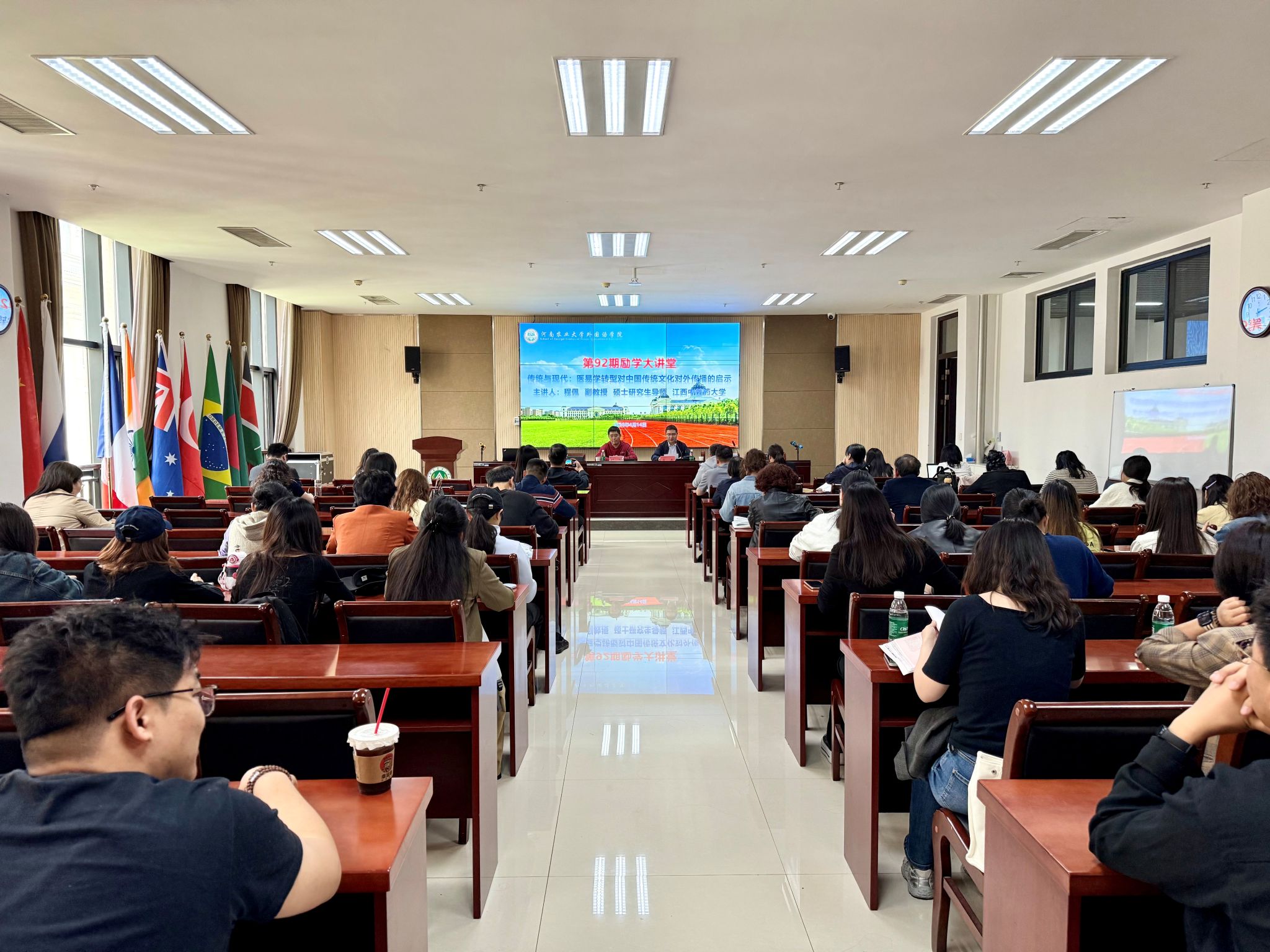 第92期“励学大讲堂”,并作了题为“传统与现代:医易学转型对中国传统文化对外传播的启示”的学术报告。报告会由副院长豆涛主持,学院骨干教师、研究生及本科生代表参加。