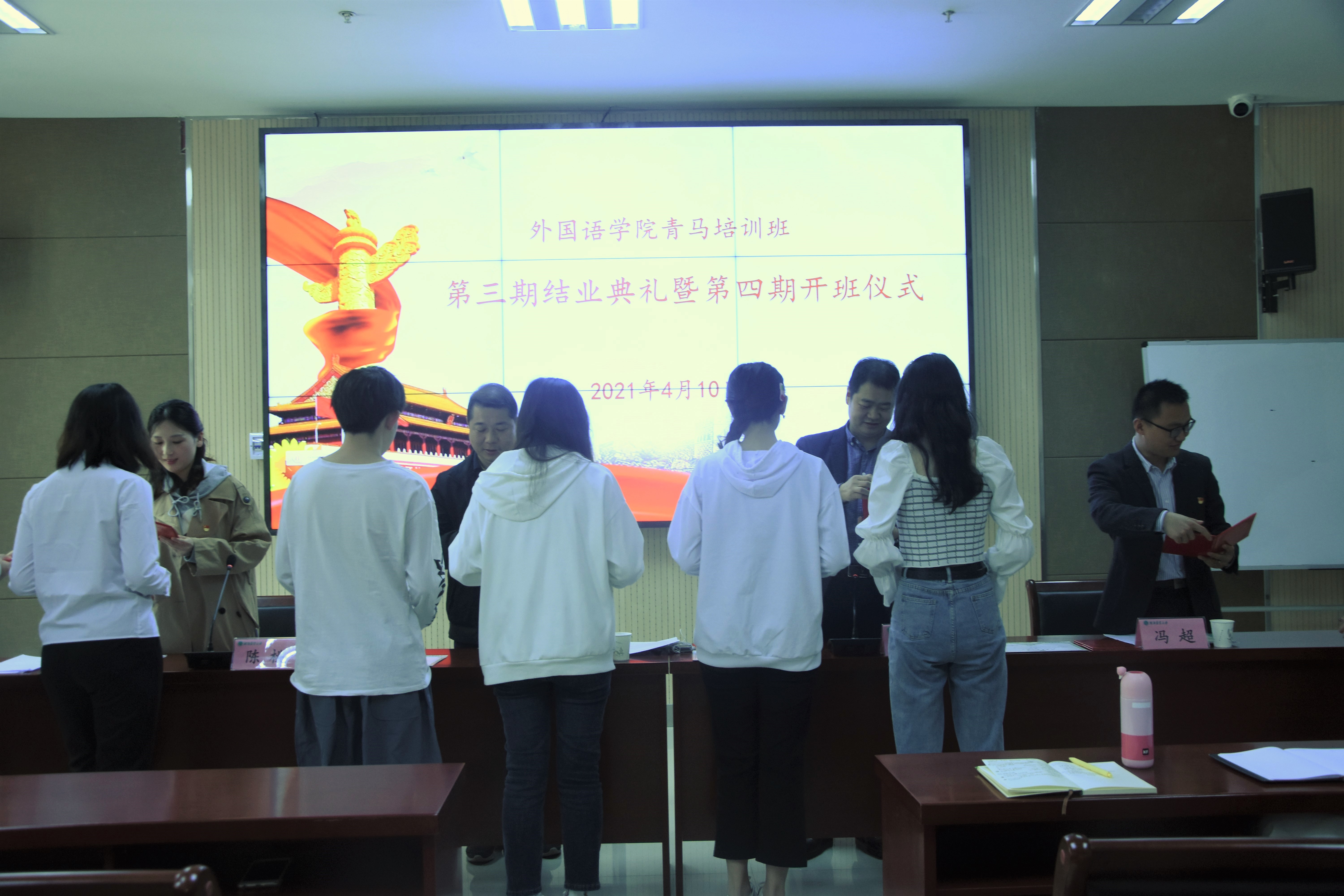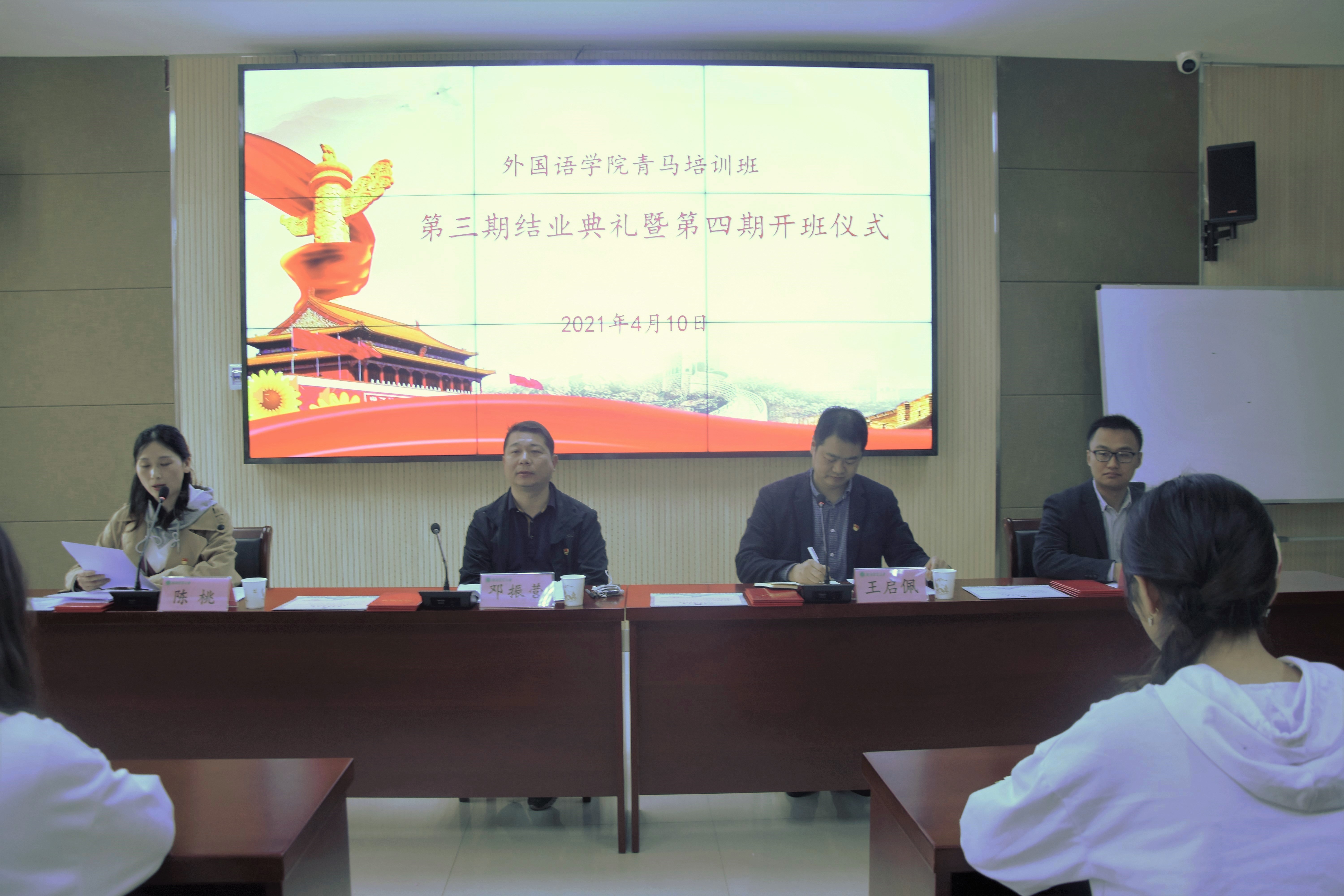 于4月10日中午12点半在龙子湖校区繁塔楼会议室A324举行了青马培训班第三期结业典礼暨第四期开班仪式。院党委书记邓振营、院党委副书记王启佩、院团委副书记陈桃、院团委书记冯超出席仪式。