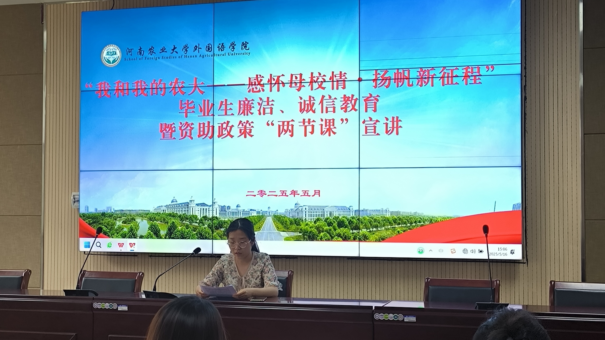 本网讯(审稿:杨鑫 供稿:武宗励 田佳瑶)为进一步做好资助政策宣传工作,着力提升资助育人实效,增强2025届毕业生的信用意识,杏吧视频 于5月16日在繁塔楼A324开展“我和我的农大——感怀母校情·扬帆新征程”毕业生廉洁、诚信教育暨资助政策“两节课”宣讲活动。本次宣讲活动由辅导员武宗励老师宣讲,2025届毕业生代表参加会议。