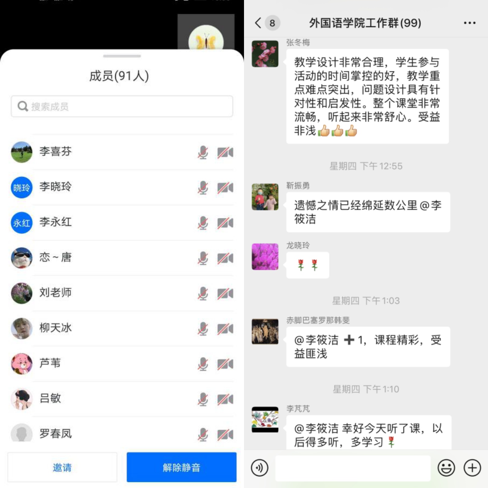 观摩课后,参加观摩的教师们在聊天区进行了互动交流,并纷纷在院微信群中发表观感,大家表示,此次观摩收获颇丰,对线上教学设计、时间掌控、师生互动等方面均有启发,并希望学院能经常组织这样的观摩活动,在同行交流中进一步提升自身教学水平。张俊杰院长表示此次观摩教学很成功,并鼓励全院教师积极探索线上教学新模式,提高网路和信息化时代的教学能力和教学质量。
